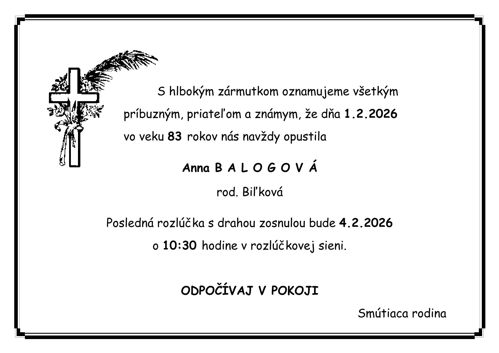 Oznámenie o úmrtí Anna Balogová